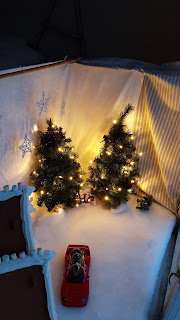 Mittemot granarna "pepparkakshuset" och en röd Ferrari med julgranen på taket :)